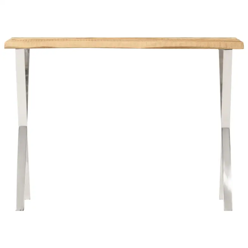 Deze wandtafel heeft een tafelblad van massief mangohout en stabiele, X-vormige poten. Hij is een geweldige aanvulling op je woonkamer of gang.